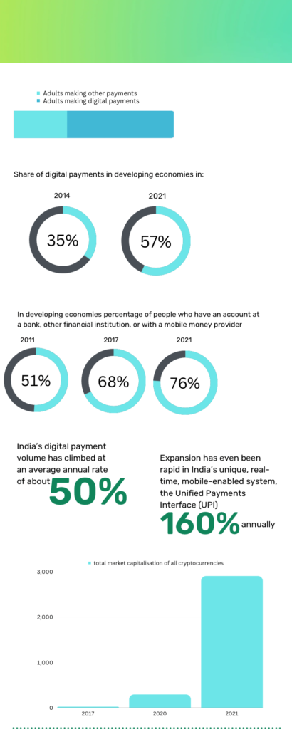 As we saw in the previous post, physical modes of payments, including cash and cheques, have disappeared from most transactions. There has been a massive expansion in digital payments, such as credit cards, in recent years. In today’s world, most people have an account in a bank or a mobile money provider. We obviously cannot ignore the invention of bitcoin and the rapid growth of cryptocurrency in the past decade.